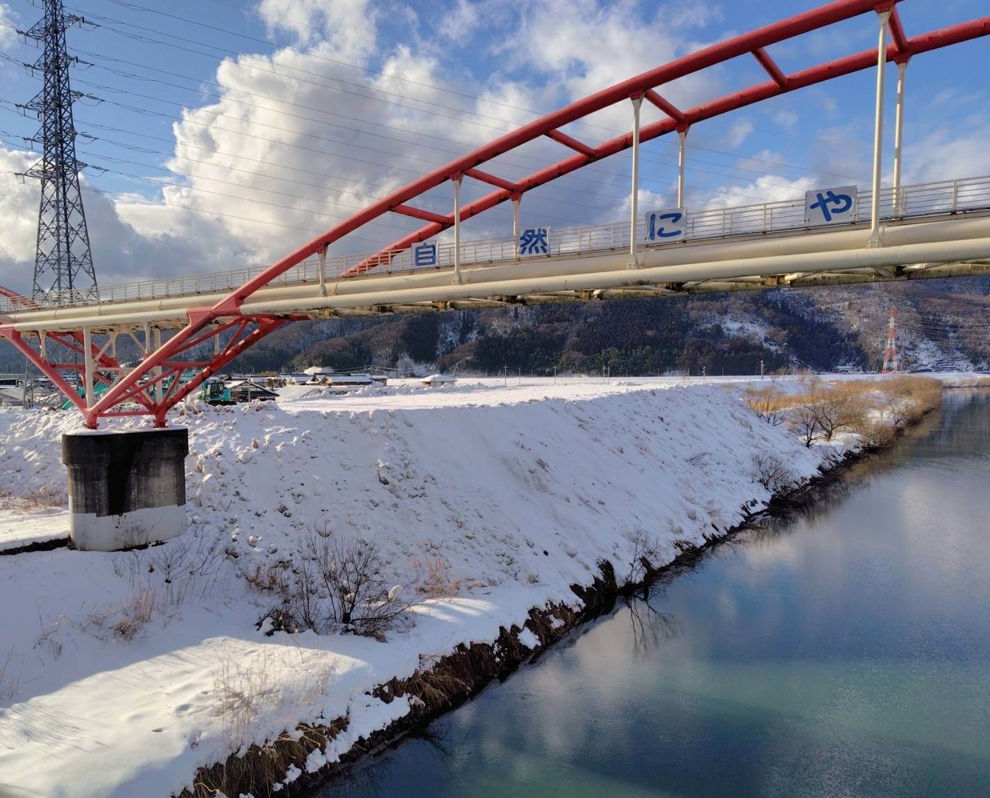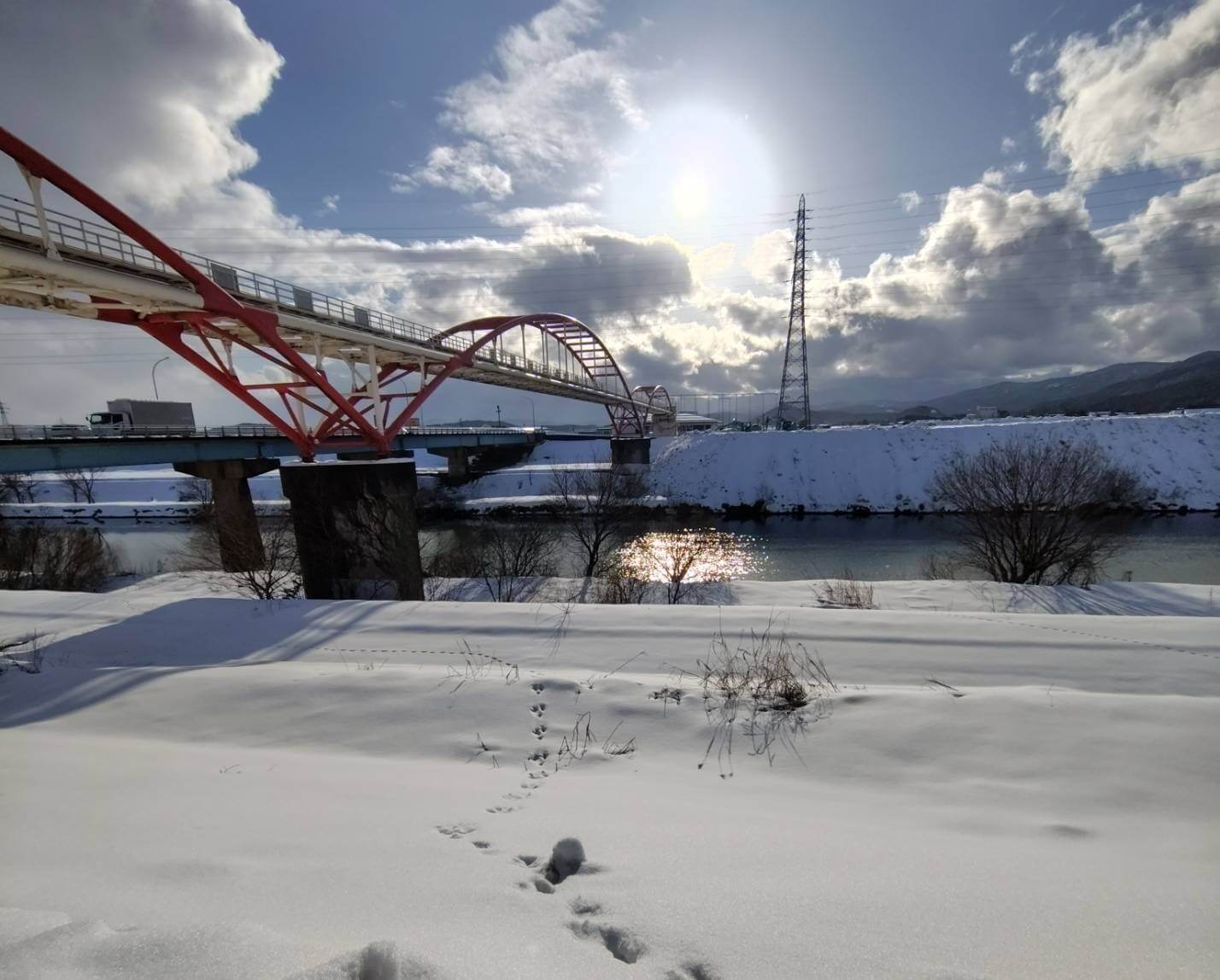 大瀬橋横の河川敷には白いグラウンドのような雪捨て場が出来ています。