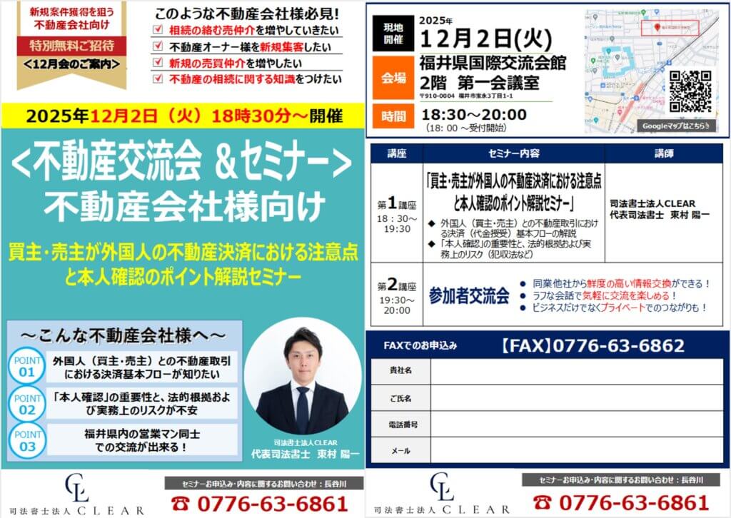 12月福井不動産交流会・セミナー 2025.11.25 News 司法書士法人CLEARでは 下記の通り不動産交流セミナーを開催致します。 12月は不動産会社様向け 【買主・売主が外国人の不動産決済における注意点と本人確認のポイント解説セミナー】 と題し、弊所代表の東村が講演致します。 この機会に是非ともご参加くださいませ。 日時:令和7年12月2日(火) 時間:18:30~20:00 ※18時~開始受付 会場:福井県国際交流会館2階 第一会議室 申込:電話またはFAXにてご予約下さい。 お問合せ 0776-63-6861(担当 長谷川)