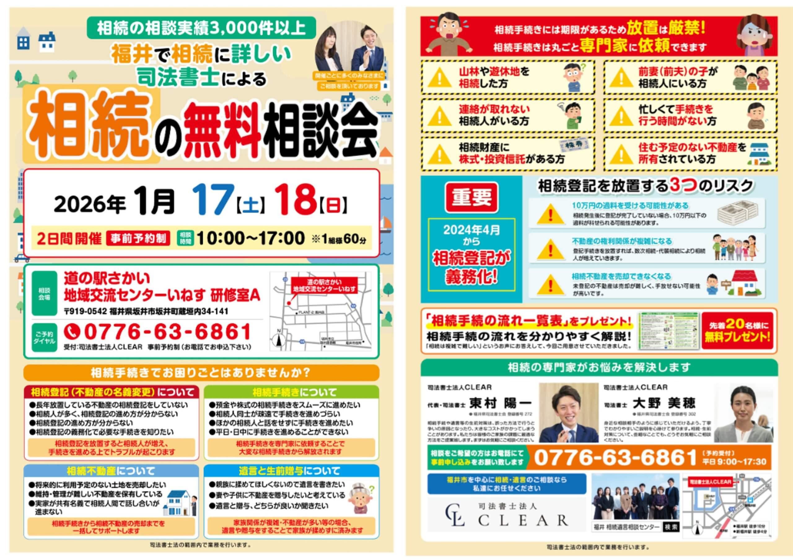 1月の無料相続相談会(坂井市地域交流センターいねす様)